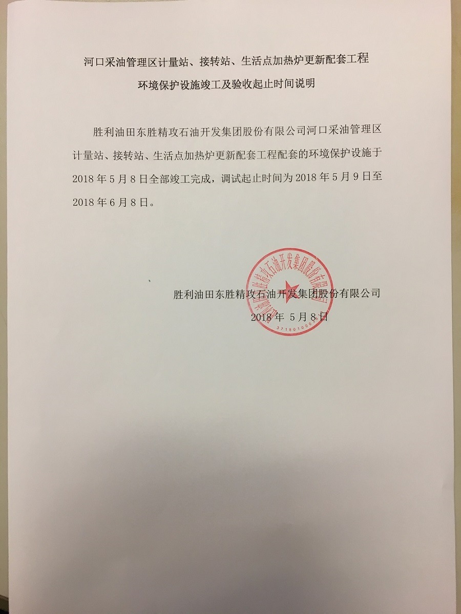 河口采油管理區計量站、接轉站、生活點加熱爐更新配套工程環境保護設施竣工及驗收起止時間說明