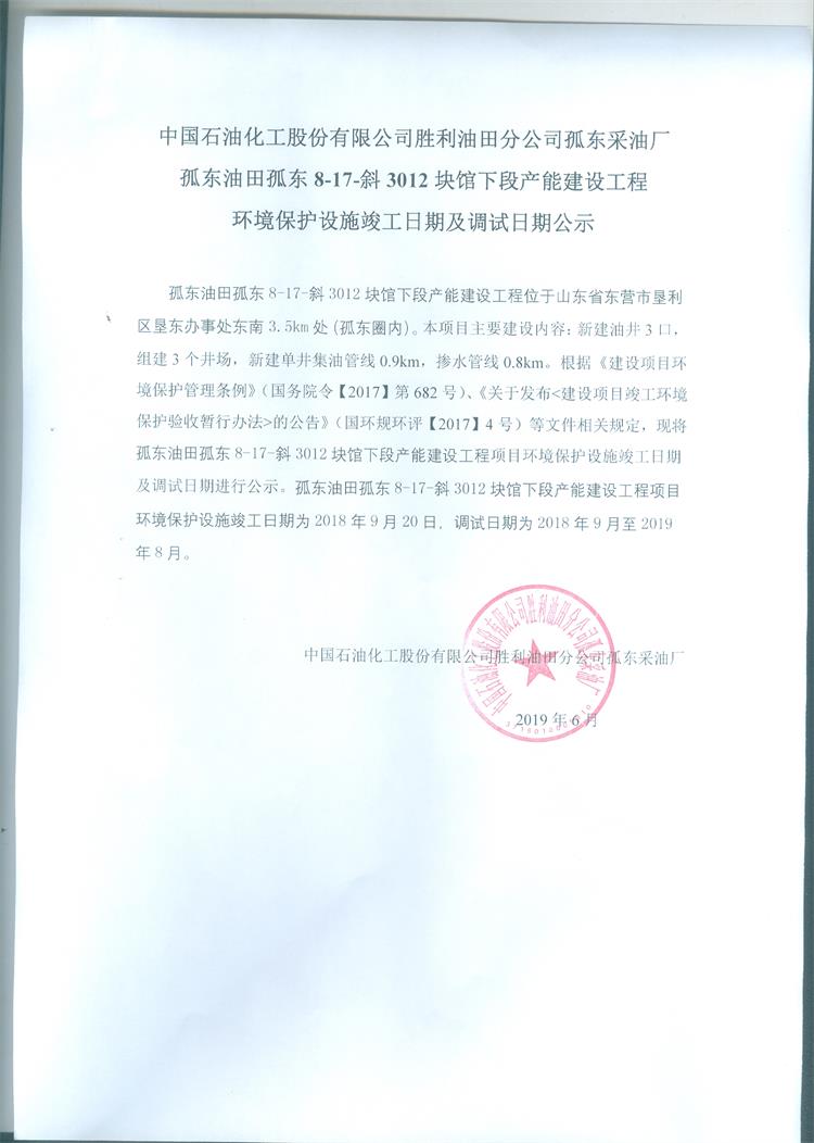 中國石油化工股份有限公司勝利油田分公司孤東采油廠孤東油田孤東8-17斜3012塊館下段產(chǎn)能建設工程環(huán)境保護設施竣工日期及調(diào)試日期公示